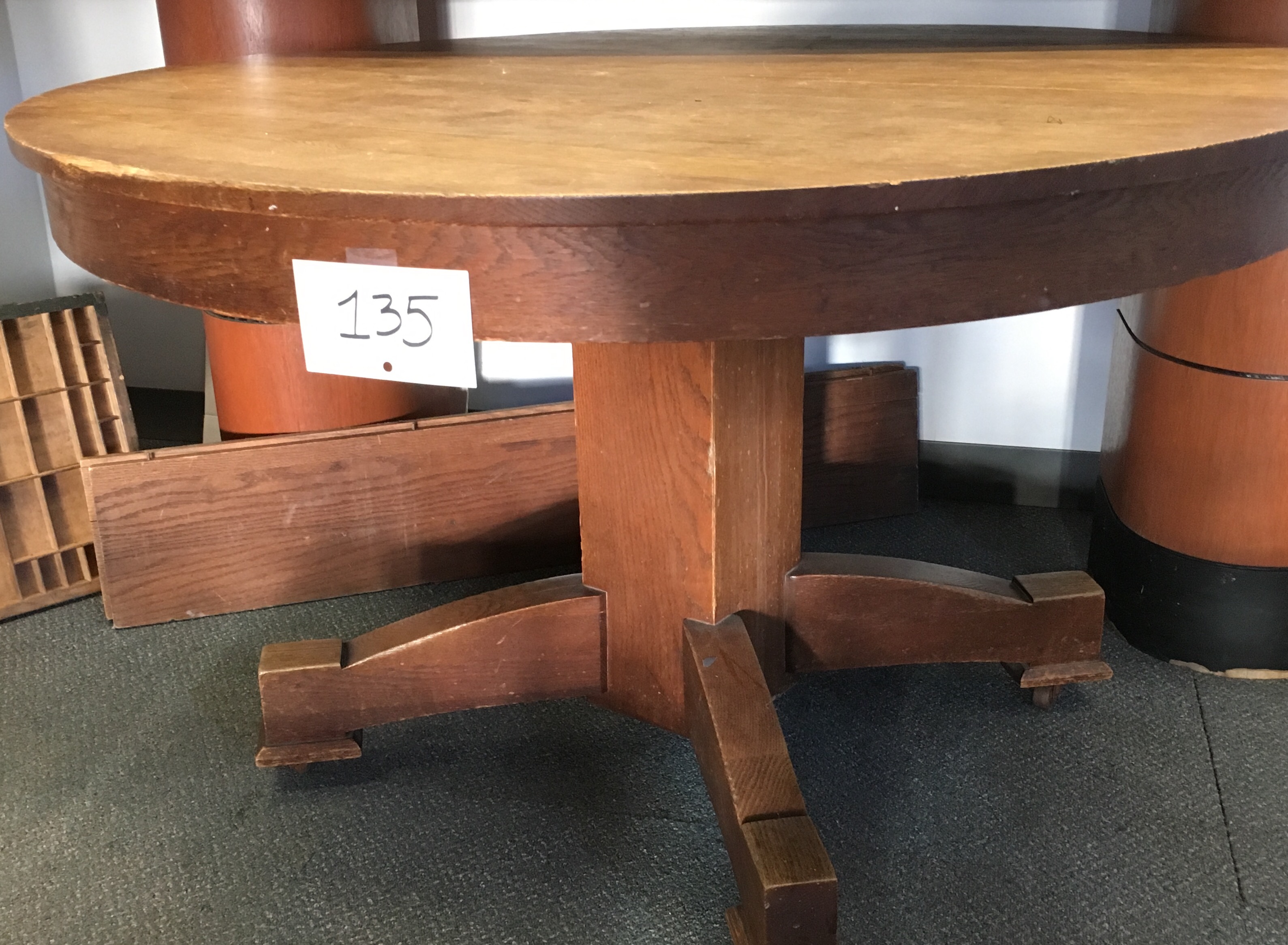 Lot 135 Round oak table + 2 leaves (4ft diam.)