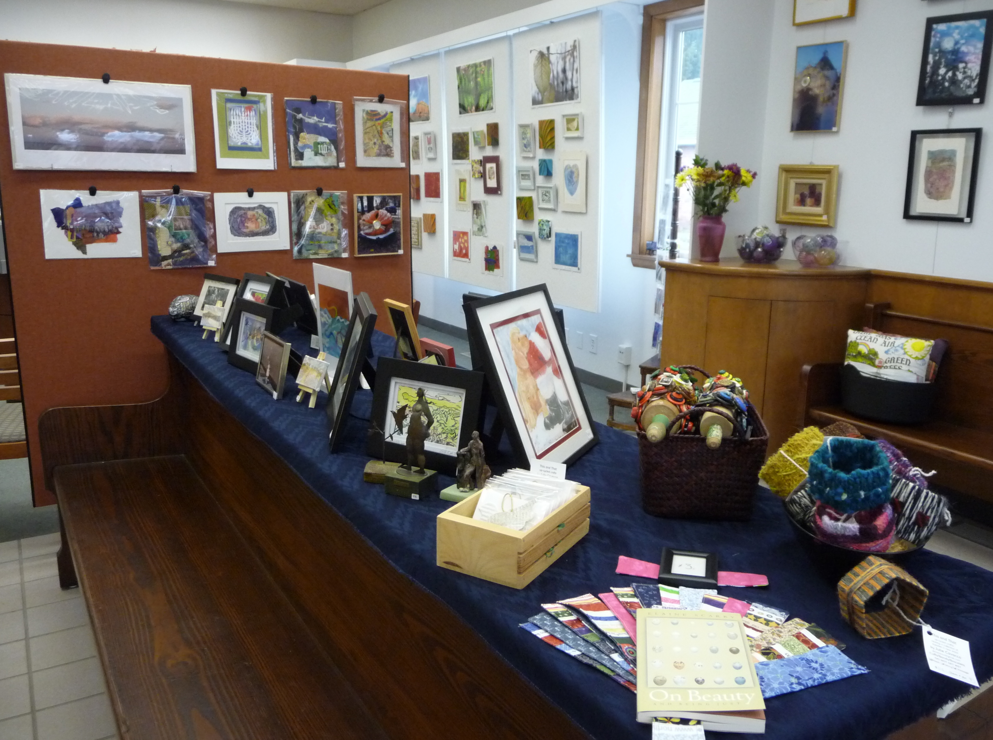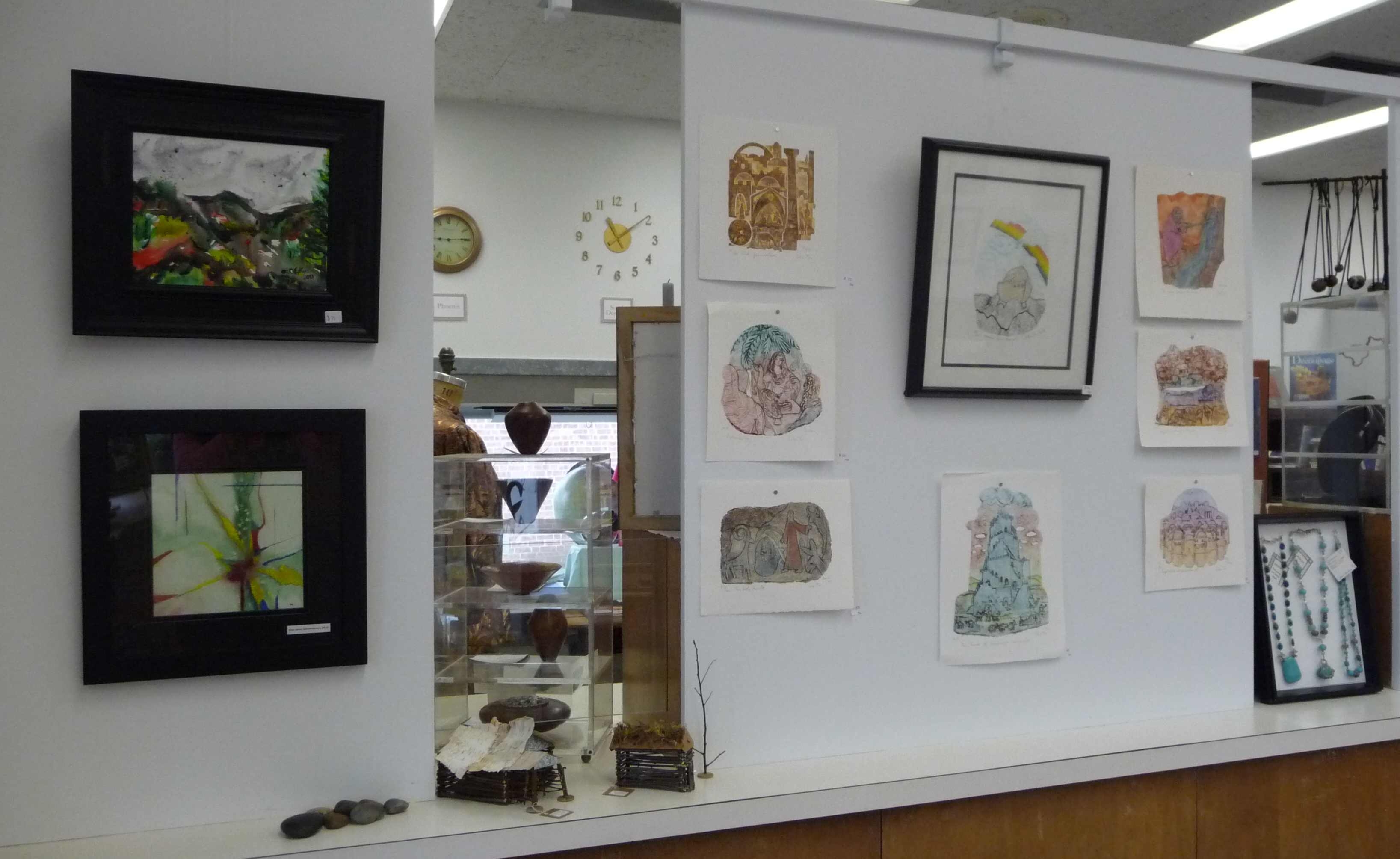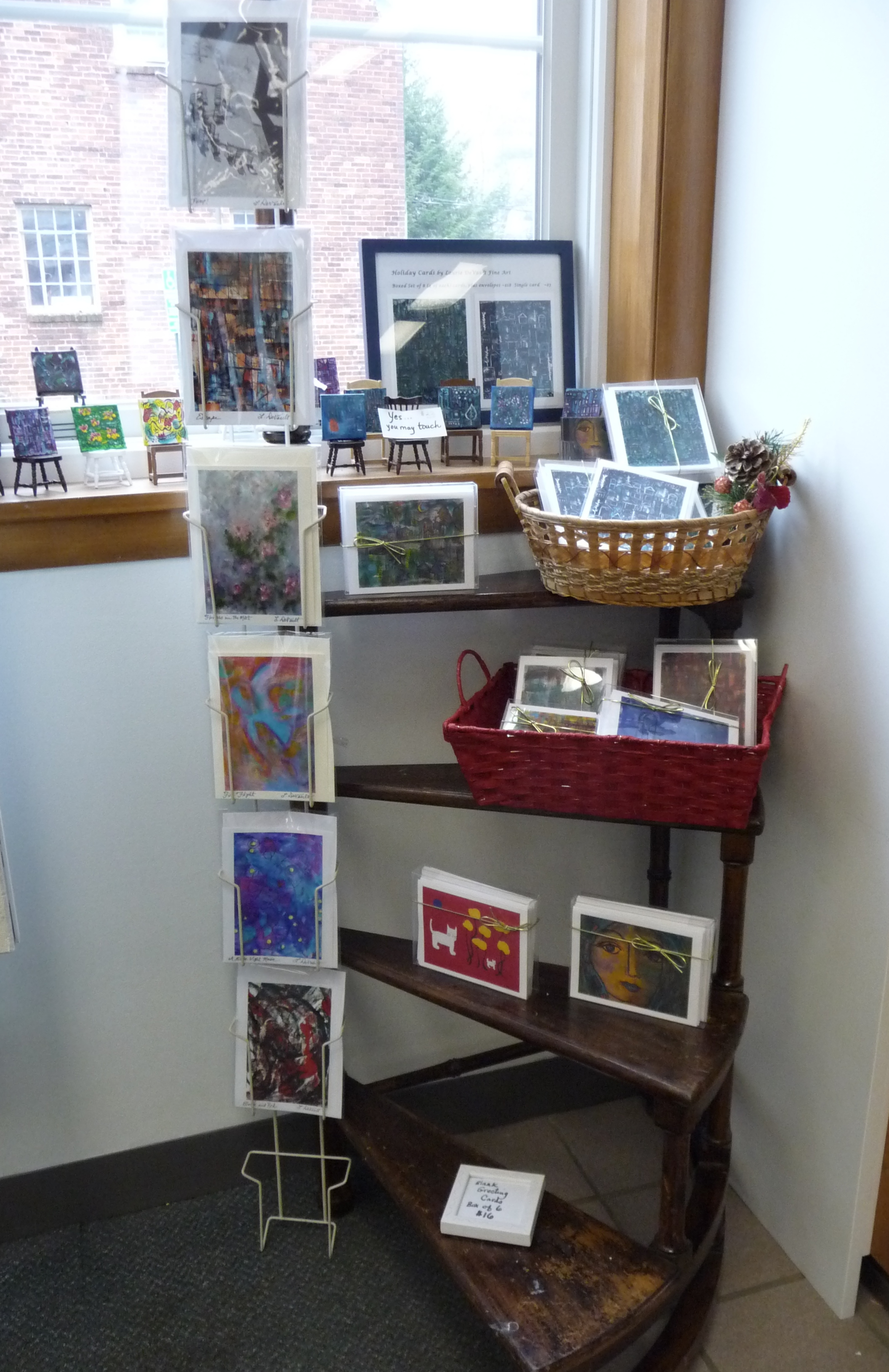 Lots of art for the wall (paintings, drawings, pastels, photographs, paper and textile collages, collographs, etc.), polymer clay & blown glass Christmas tree balls, embroidered felt hamsas & ornaments, patchwork bookmarks, painted rocks, fantasy houses from twigs, pillows, aprons, miniature chairs, lamps, clocks, yarn and button bracelets, papercuts, turned woodpens and small bowls, wooden cutting boards, metal clay & polymer clay jewelry, painted tiles, Thaisilks, books on art, and ‘millions’ of varied seasonal note cards by many different artists!