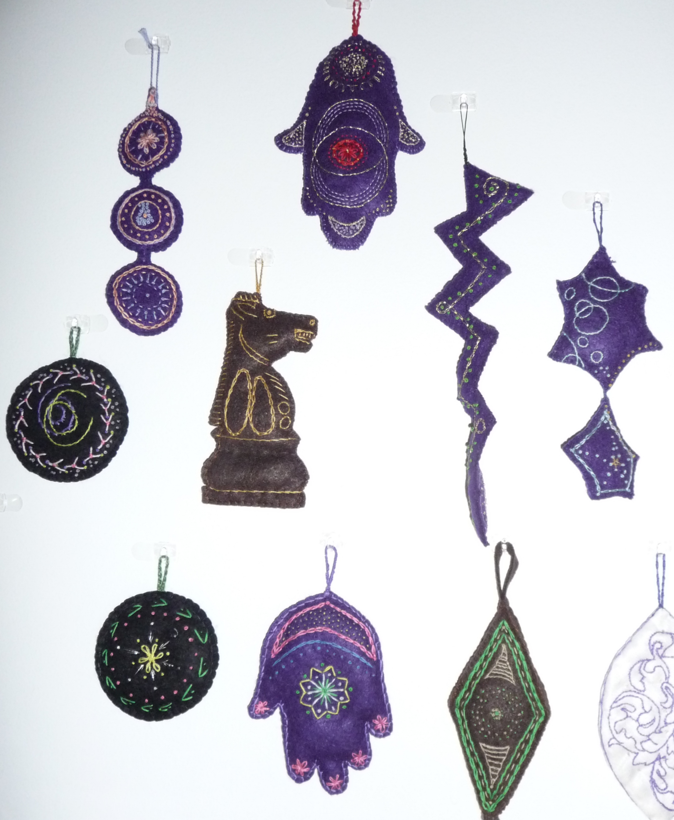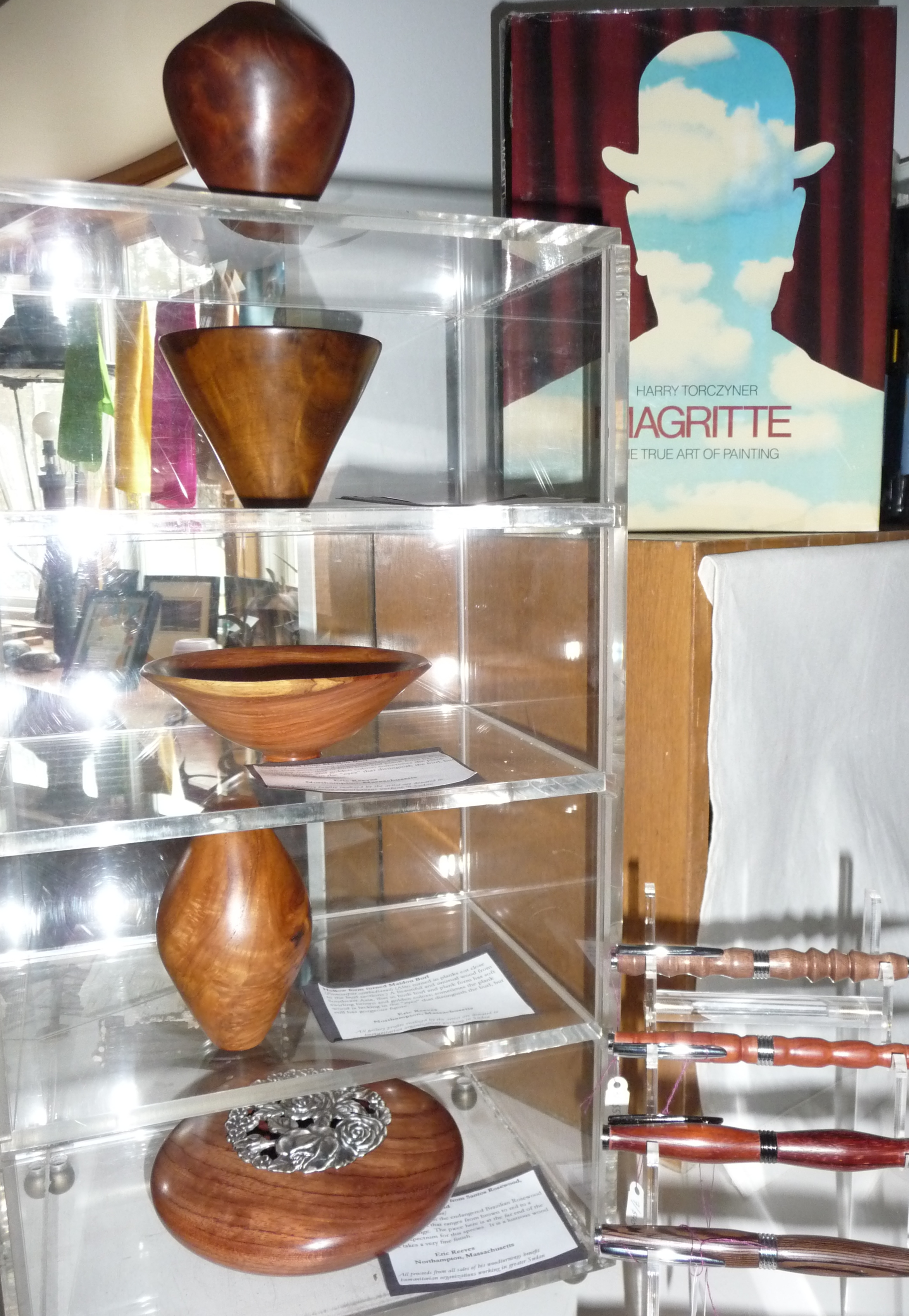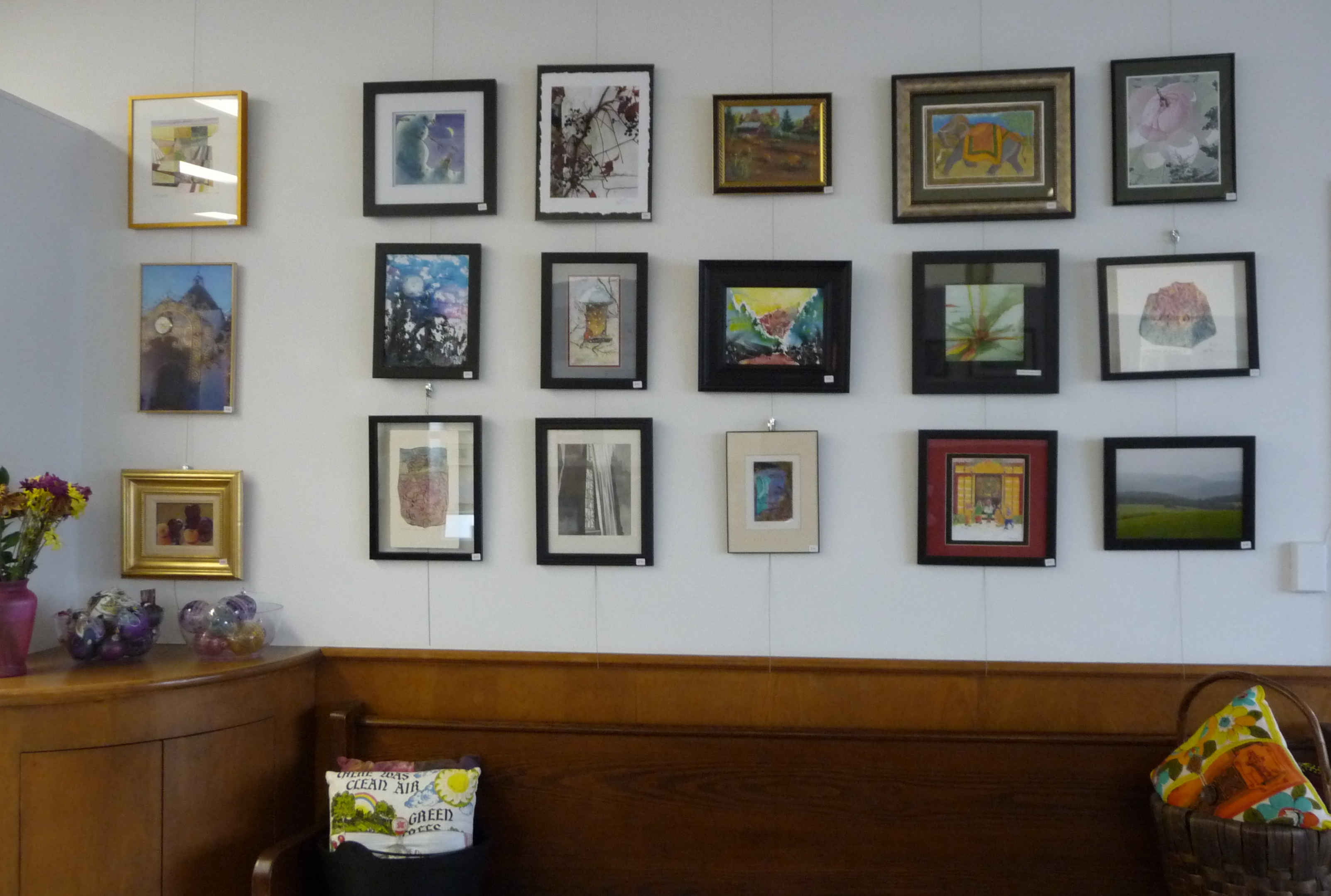 Lots of art for the wall (paintings, drawings, pastels, photographs, paper and textile collages, collographs, etc.), polymer clay & blown glass Christmas tree balls, embroidered felt hamsas & ornaments, patchwork bookmarks, painted rocks, fantasy houses from twigs, pillows, aprons, miniature chairs, lamps, clocks, yarn and button bracelets, papercuts, turned woodpens and small bowls, wooden cutting boards, metal clay & polymer clay jewelry, painted tiles, Thaisilks, books on art, and ‘millions’ of varied seasonal note cards by many different artists!