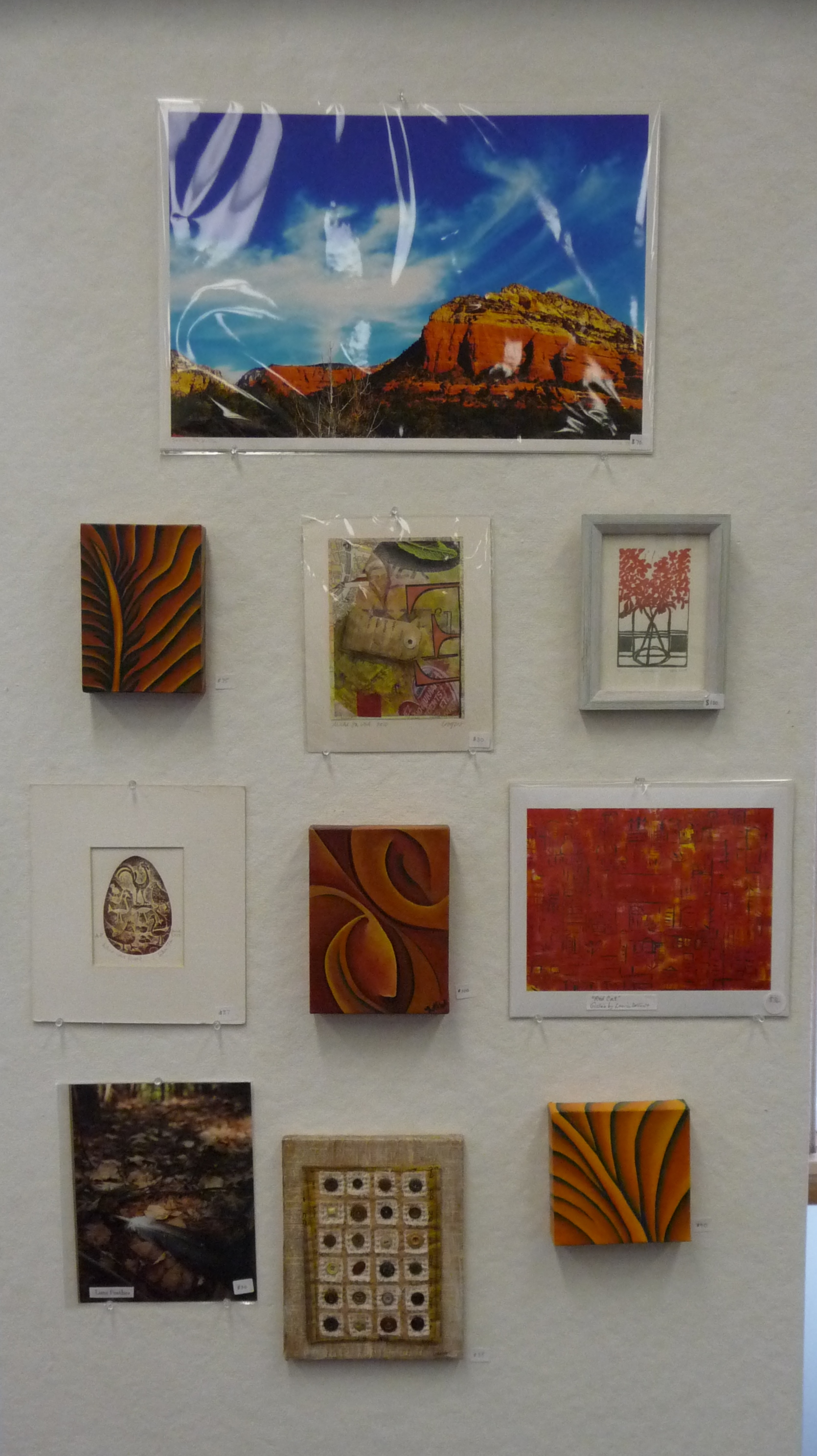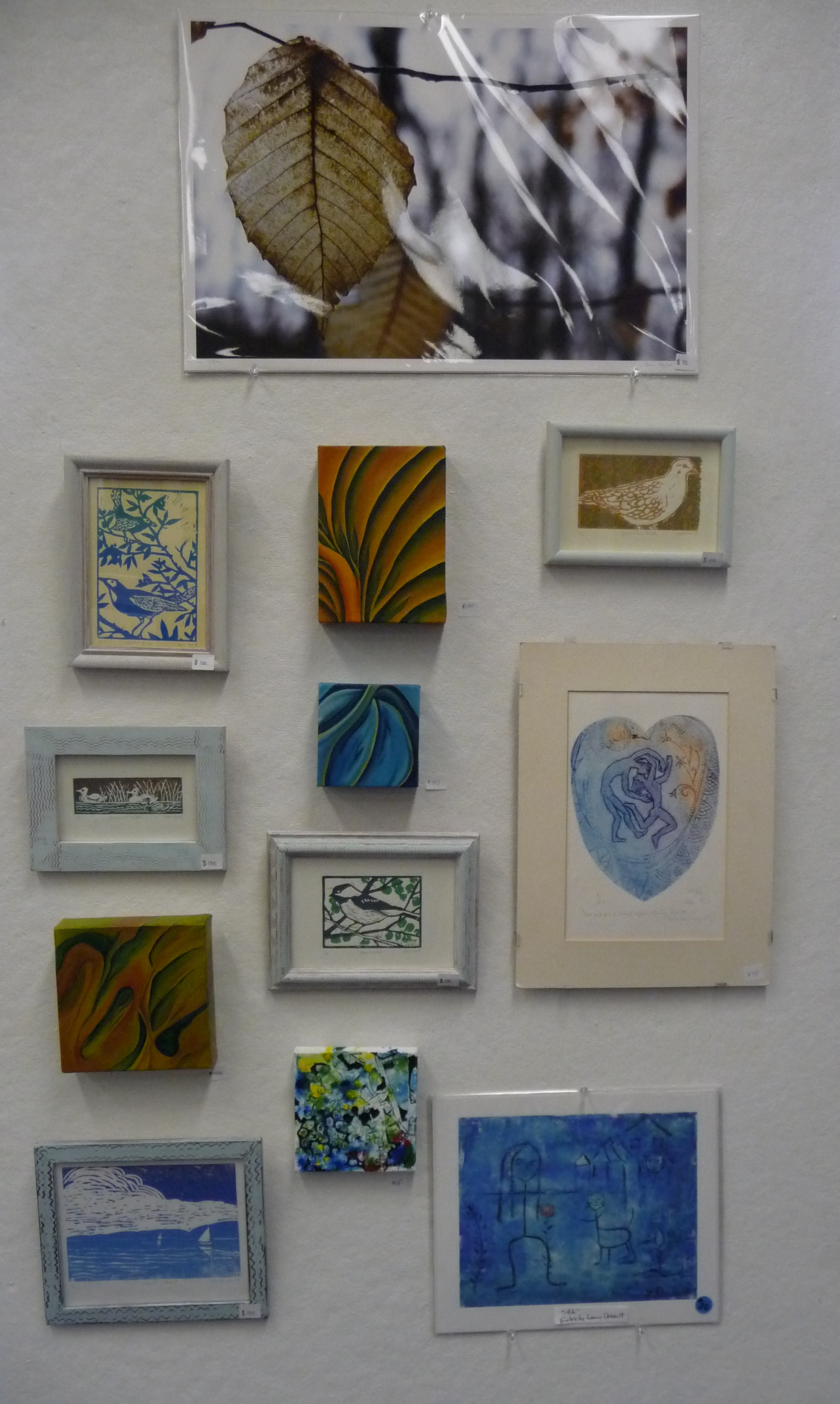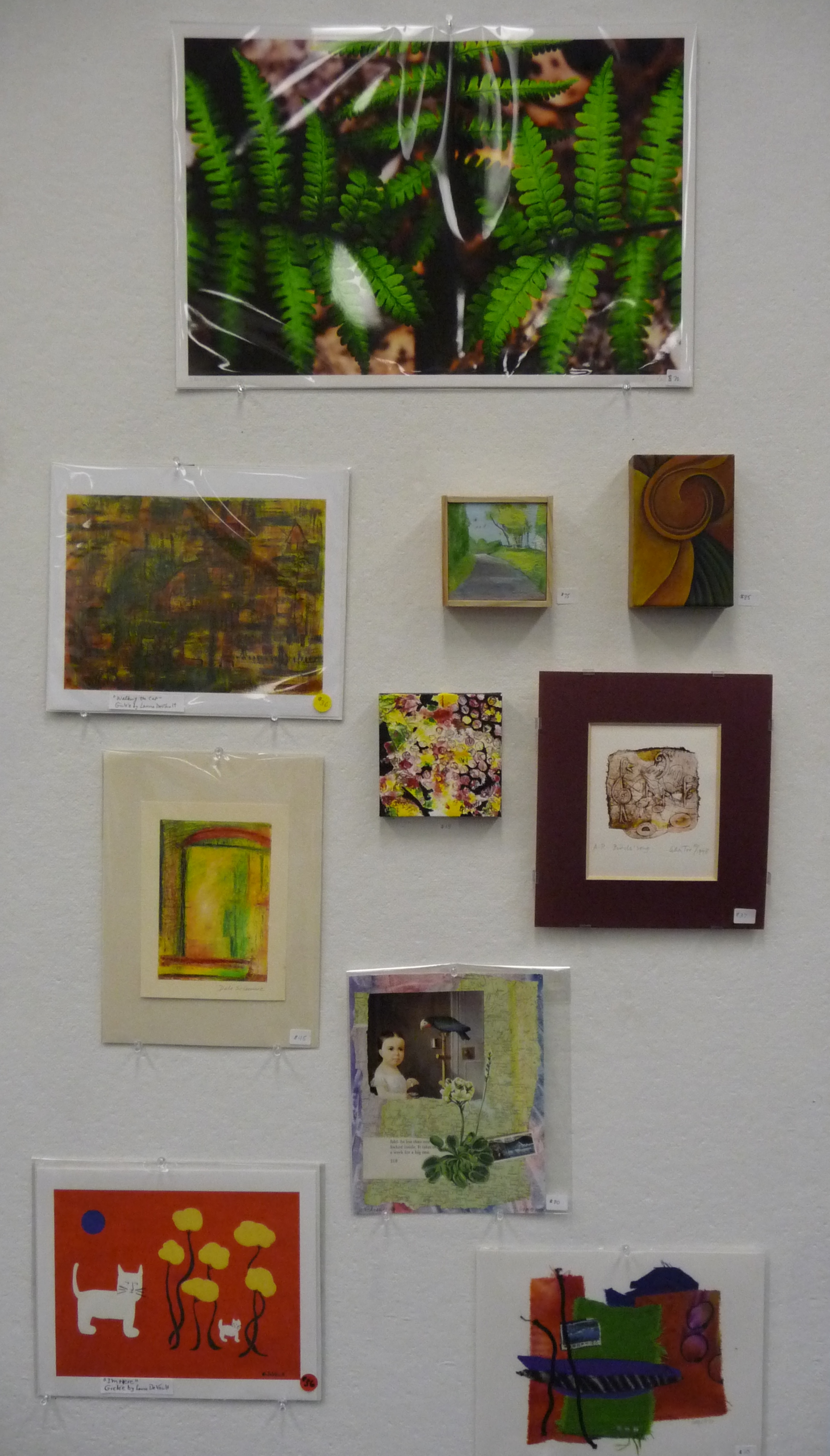 woodblock print by Benjamin Sears, oil pastels by Dale Schwarz, oil paint by Stephanie Vignone, lithography by Kimberlee Zacek, papercut and constructions by Tavi Wolfwood, Lu Vincent and Margaret Humbert-Droz (right), ink and oilstick by Tracey Physioc Brockett, photography by Andy Cavacco, digital prints by Rachel Hankinson, Anita Licis-Ribak, Lourdes Morales, Maurine Sutter, Betsy Todd, and basic pencil by Mary Kendra Crawford and Emmet Nathaniel Blanchette.